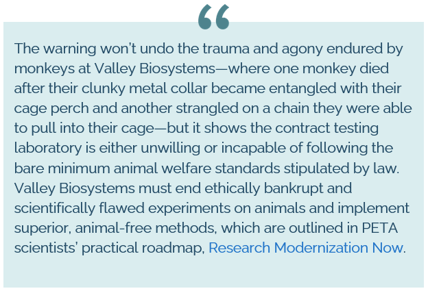 Sacramento – Please see the following statement from Amy Meyer, Associate Director of Primate Experimentation Campaigns at PETA, regarding a just-posted enforcement action taken by the U.S. Department of Agriculture against Valley Biosystems, a contract testing laboratory in West Sacramento. The facility, which used 371 monkeys in experiments and confined another 1,247 monkeys last year, has received an Official Warning, a rare occurrence reserved for the most egregious offenses. The agency’s action follows USDA’s earlier pair of critical violations of the federal Animal Welfare Act at the laboratory for incidents in which two monkeys died by strangulation in separate incidents: